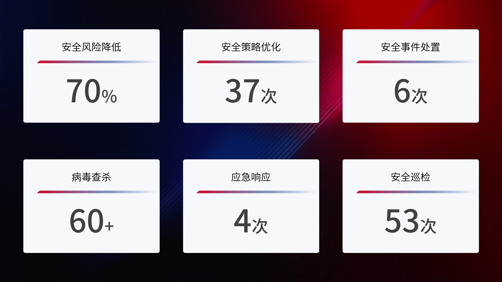 提供全面的安全事件报告体系,,,包括处置报告、、、、周报、、季度和年度总结,,结合持续监控,,,,帮助客户深入了解网络安全状况。。。