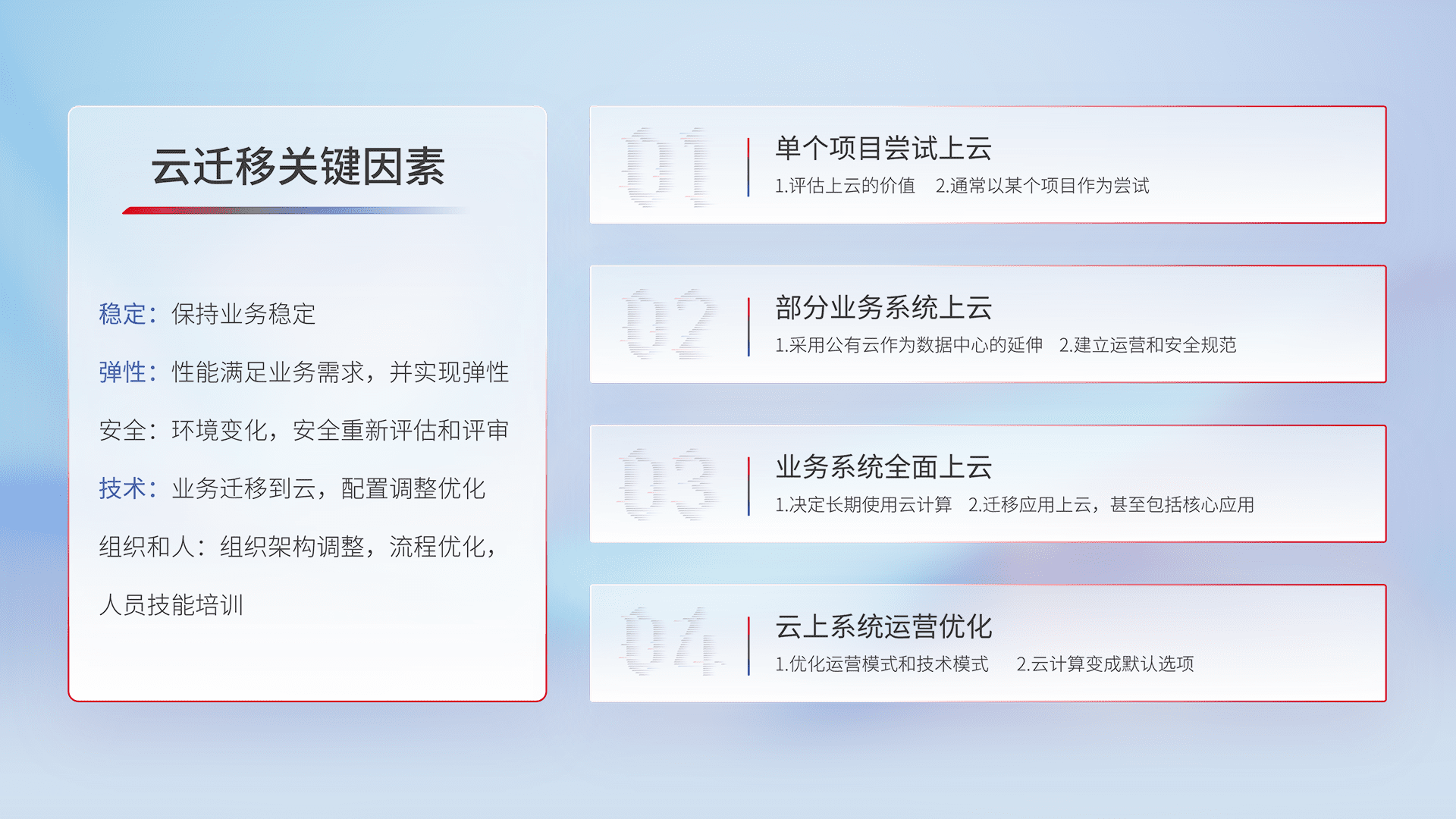 结合实际业务,,,从规划设计、、、云平台选型、、、云原生改造、、、、数据迁移、、、、集成交付,,迁移全过程为客户识别最佳上云路径,,,,做好风险识别管理,,,,设计网络架构、、身份权限、、、、安全审计合规、、操作审计、、、、日志审计、、、、监控告警策略、、、多站点容灾设计等,,,,对云上基础设施进行整体规划,,提升IT治理水平,,,以满足弹性、、、高可用、、、高性能的需求。。
