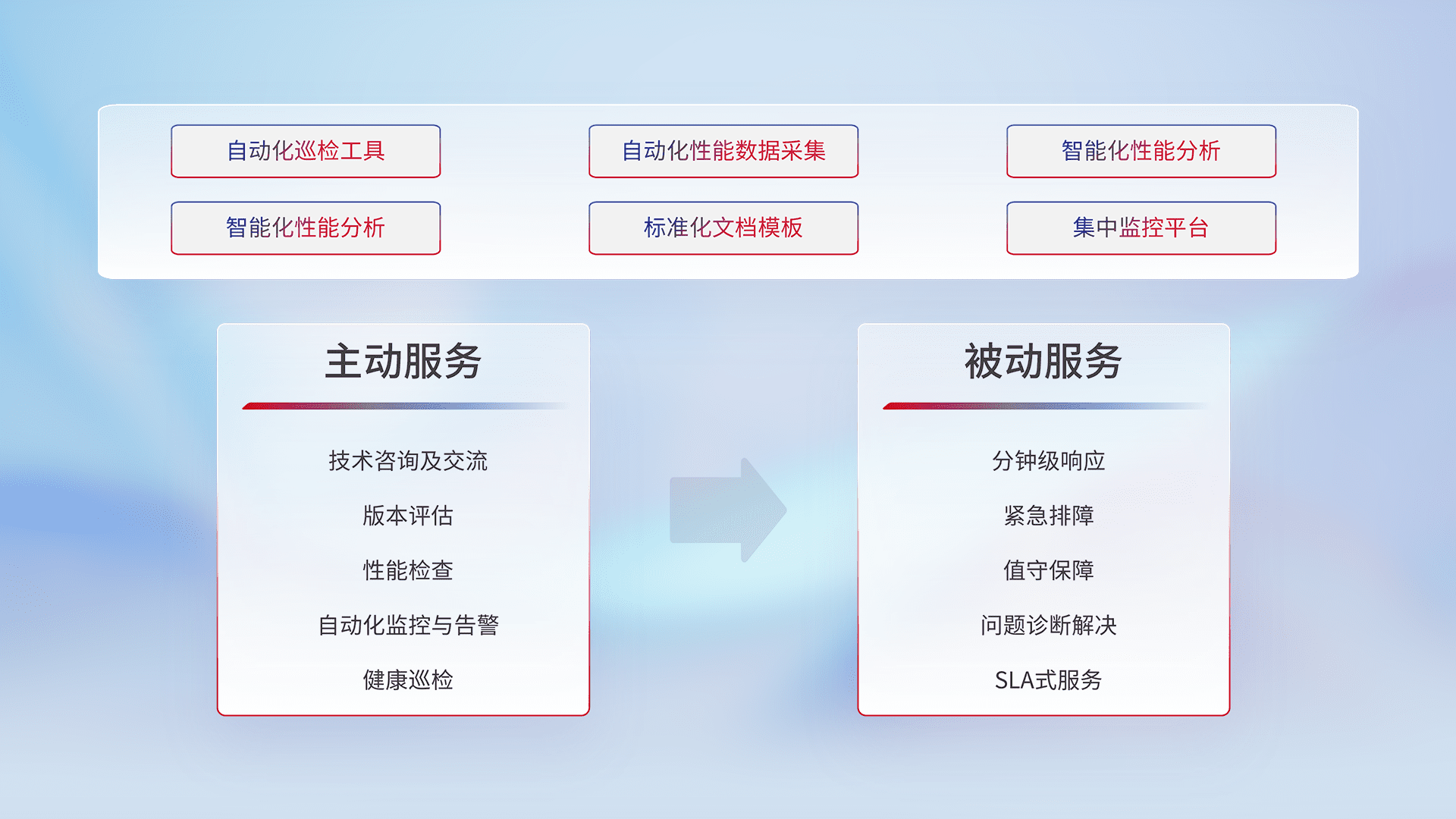 智能化工具和标准化文档,,,保障服务质量,,,,提供主动服务(包含技术咨询、、、版本评估、、性能检查、、、自动化监控与告警、、、、健康巡检)和被动服务包含(分钟级响应、、、紧急排障、、、值守保障、、问题诊断解决、、SLA服务)。。。。